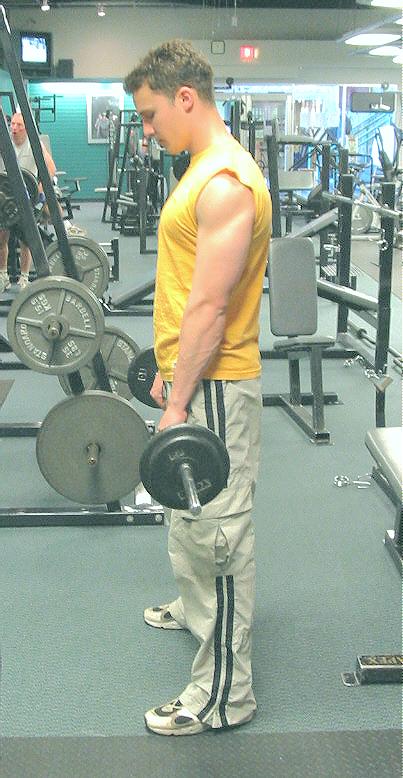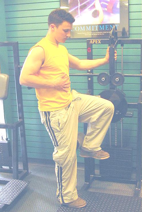 Another create exercise. This exercise is most often seen with the lower back arched and bent over, weight on the floor or lower (sometimes performed on a box so that the weight travels below the plane of the feet). However, in this variation, keep the back straight and pivot from the hips pushing the butt out and feeling the stretch in the back of the legs. DO NOT PUSH THE STRETCH! Straighten by tightening the hams and the butt. There are two breathing techniques to this exercise. One is to breathe out when bending forward and the other is to breathe in. Due to my back problems, I breathe in when leaning forward. Pick what is comfortable for you. CORRECT FORM IS A MUST! DO NOT force the stretch. Pivot from the hip and not from the lower back! |