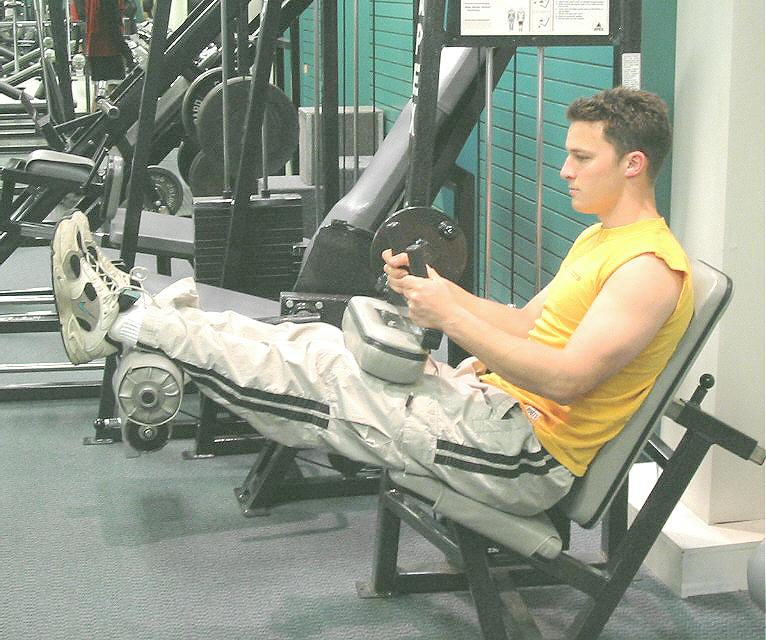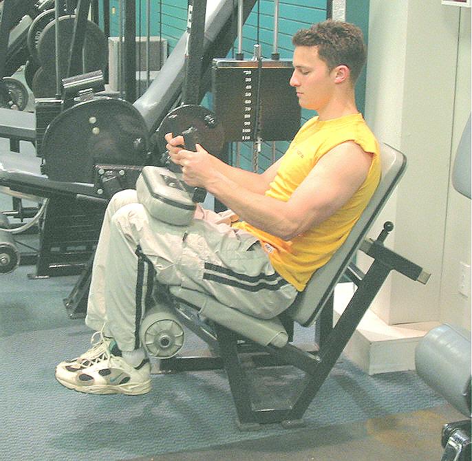 There are different opinions regarding hamstring curls and what type of machine to use. This exercise piece of equipment places minimal strain on the lower back (as opposed to the prone or flat leg curl bench). When using this machine, make sure that the 3 heel, knee and back pads are adjusted correctly. The foot pad should remain in contact with the heel through range of motion without rolling up the back of the leg and the knee pad tight against the lower thighs. Keep back of legs tight against seat pad and lower abs tight. Breathe out when curling, out when extending. |