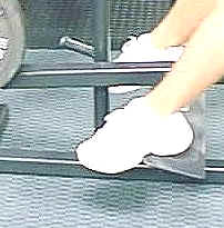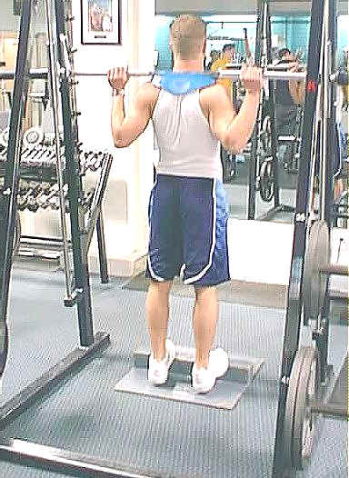 Standing Calve Raise - Using the smith machine and the shoulder pad as shown takes some of the stress off of the back and neck area. This also takes the risk off of trying to balance heavy weights. Shown in this photo is the lower of flexed phase of the lift. | |
