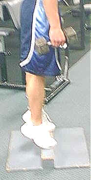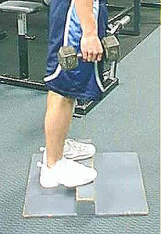 The objective of free standing calve raises is primarily joint stabilization. Hockey is a game of balance and the stronger the ankles the better the transfer of power into skating skills. Using dumbbells, raise and lower body weight as shown feeling slight stretch at bottom (SLIGHT) and extending to full contraction. Down slowly in control and explode upwards. |