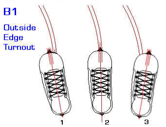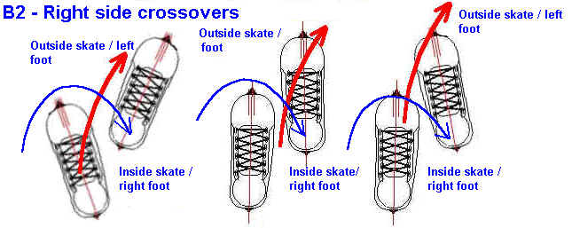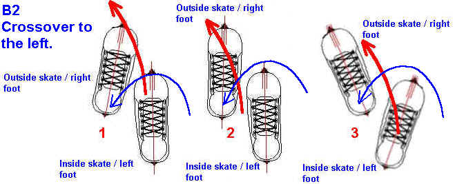 Diagram B2 (left and right sides) represents the position of the skate on the crossover. Is the outside foot pointing down ice or "leading with the heel" (1), neutral position; leading slightly with the heel or flat of the blade (2) or up-ice, leading with the toe of the blade (3).