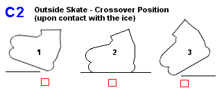 The following diagram C1 and C2 represents the outside foot; crossover (C1) and ice-contact position (C2) . Mark which foot position best represents your outside foot position on crossover as outside foot crosses over inside skate and position or angle of boot upon contact with ice.