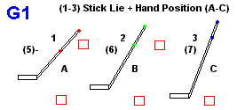Diagram G1 Depicts basic stick lie used as well as hand "primary hand position" on the stick. Mark which style best represents your style of carrying puck with two hands. Do you grip stick firmly with both hands (static position) or do you vary your bottom hand grip position continually which is shown in Diagram G2.