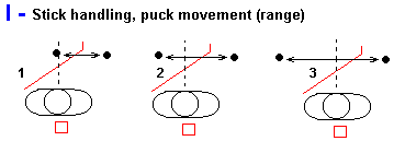 In the following Diagram I, pick the diagram that best represents lateral movement of the puck side to side when striding down the length of the ice. As in diagram (1), does the puck cross the center line of the body on the when switching to backhand side of the blade, (2) does the puck come ahead of the outside leg position which switching to the back hand side or (3) move completely across both sides of the body maximizing range on the backhand side.