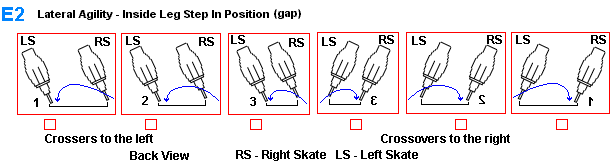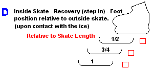 Diagram D describes the Inside foot position on recovery. These pictures demonstrate position of the inside foot as player brings foot back to inside position after under cross (pushing through under body). Mark which style best represents your foot position. This is best viewed from the inside. Some players when bringing the inside foot into position or "stepping in" position the skate to far ahead of the outside foot. This in turn, causes slippage of the outside skate resulting in incomplete extension as well as poor recover action.