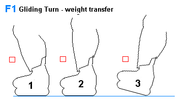 Diagram F1 - Gliding turn. This turn represents either a moderate (not tight) to intermediate radius turn. Mark in the appropriate box which foot\ blade angle best represents your style of turning. (1) Knee is aligned over the toes, weight is distributed evenly over the middle of blade with the knees and ankles flexed, (2) Knee / leg is in a more upright position with body weight moving towards back half of the blade and, (3) Inside foot is ahead of the knee with heel making contact with ice.