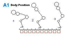 In diagram A1, young players or players that are too tired to utilize correct form, bend over to try to maximize effort. This is due to the fact that the Gluteus muscle (butt) is stronger than the muscles of the lower thigh and therefore fatigue later. In diagram A2, players tend to lean forward due to lack of balance in most cases (insufficient outside edge control) or stand up too straight as in model (3) which more specifically demonstrates weak thigh muscles (a growth spurt perhaps).