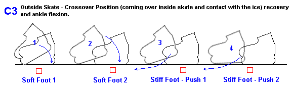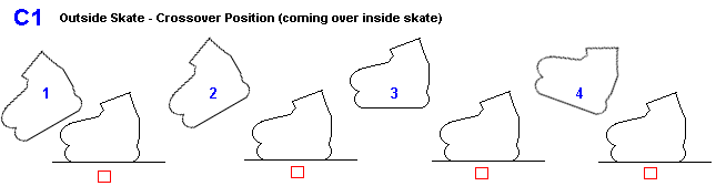 In diagram C1 - (1) is close boot position with toe down, (2) is again with toe down slightly but ahead of inside skate, (3) is blade in a level position as it comes up and (IN FRONT OF - NOT OVER) the inside skate and (4) - Is ahead of and again, NOT OVER the inside foot with the heel down.