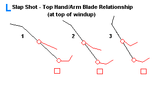 Diagram L - Slap shot - top hand/arm blade position during windup or loading phase. This is best described by the position of the blade at the top of the windup. If the blade is pointing towards the ceiling and your back arm is bent, mark box (3). If your back arm is straight the the blade is parallel to the ice, mark (1), (2) is in-between.