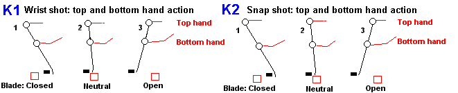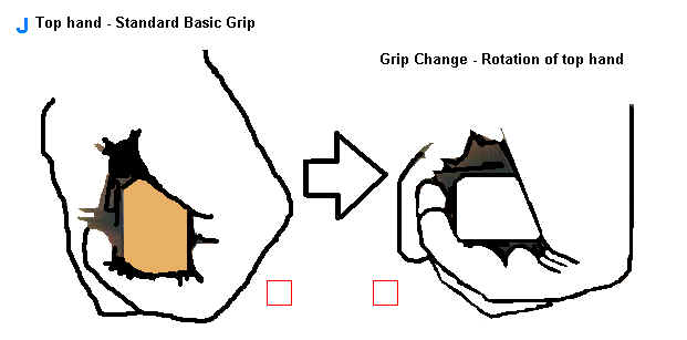 Diagram J - Top hand Shooting Grip - Re-grip. If you do not change your top hand grip during your snap and wrist shots, mark box 1. If you do mark no. 2. The grip change shown is for the slap shot which is best when utilizing a 1/4 turn which places the blade and shaft in the maximal flex power position (requires good grip strength due to rotational action of shaft upon contact with the ice).